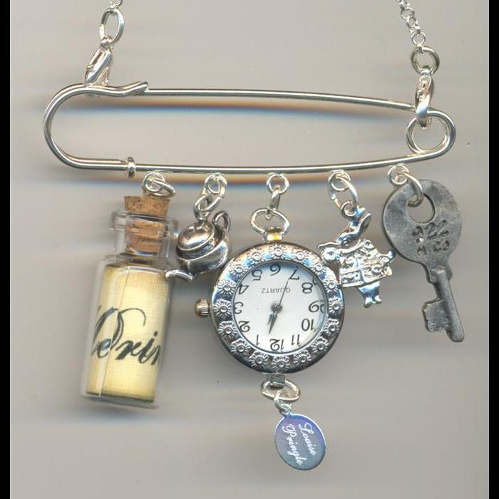 Kilt-pin brooch/necklace made with kilt pin (width 8cm), 'drink me' bottle, teapot charm, battery operated watch (upside down like nurses watch), mad hatter charm, key. Detachable chain for when wearing as a necklace- chain length 73cm.