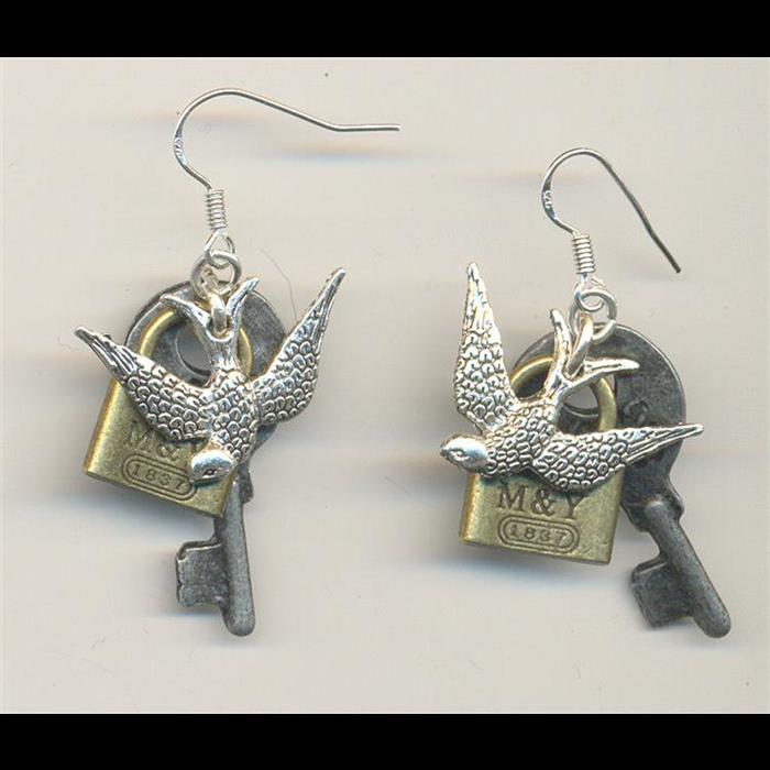 Earrings made with keys, mini padlock charms and swallow charms. Sterling silver hooks.