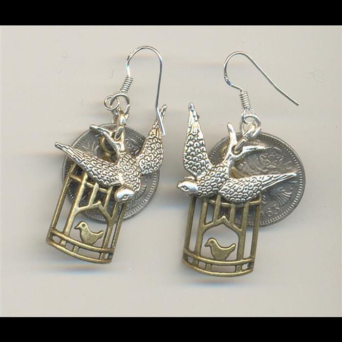 Earrings made with sixpences, birdcages and bird charms. Sterling silver hooks.