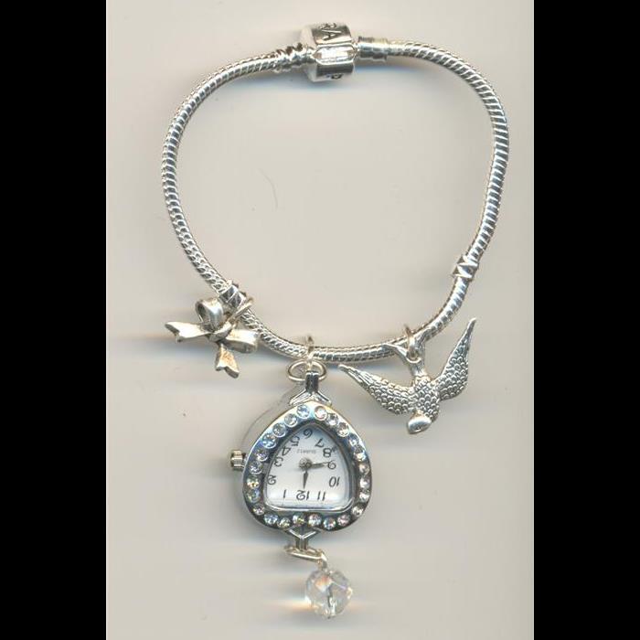 Bracelet with battery operated watch, bow and swallow charms.
