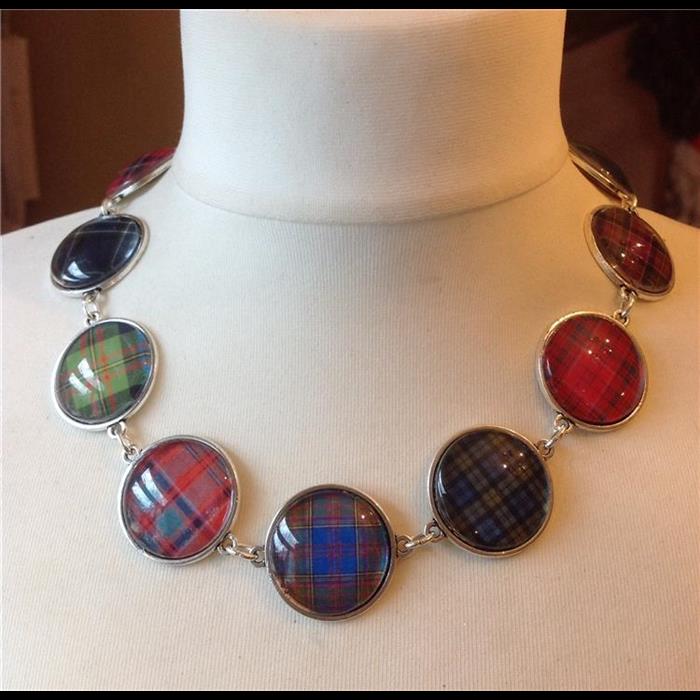 necklace made with tartan covered glass disc pendants. Length- adjustable chain to fit all neck sizes.
