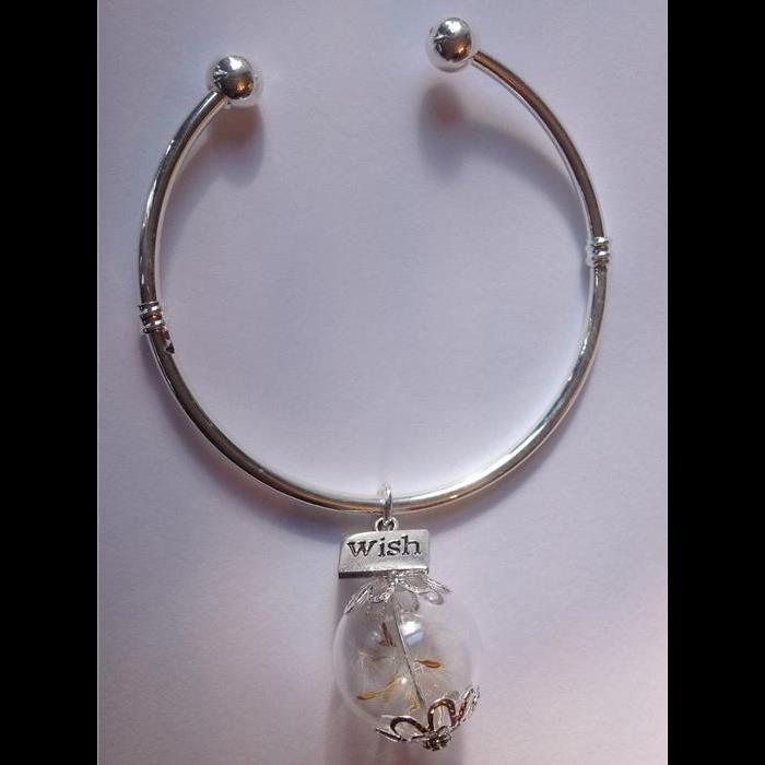 Torque bracelet with dandelion in glass globe and 'wish' charm.