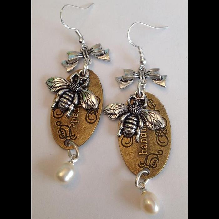 Sterling silver ear hooks. 'Handmade' pendants, bee charm, bow charm, freshwater pearl drop. Length of drop 6cm.