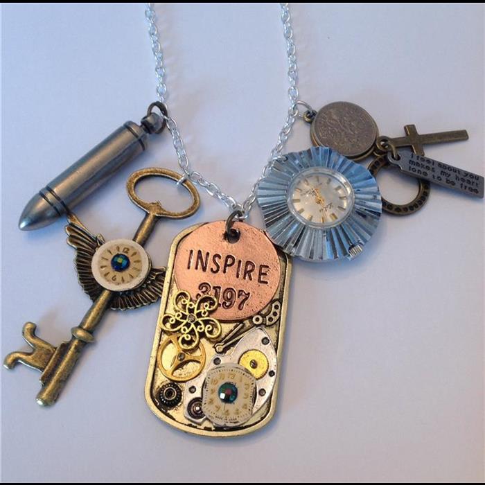 Long chain necklace with bullet pendant, real vintage wind up working watch, old sixpence, key, and watch works pendant. Chain length 72cm.