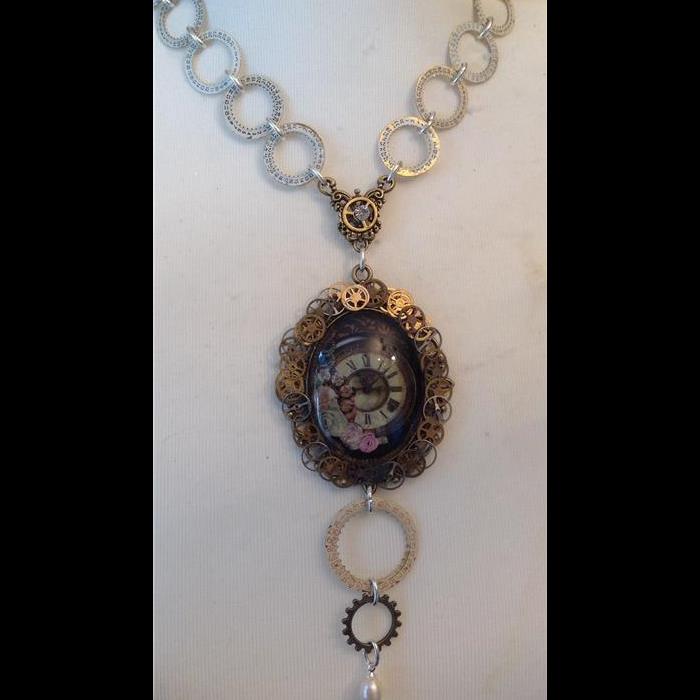 Beautiful necklace made watch picture pendant, (height 5cm), vintage watch number dials, vintage watch cigs, freshwater pearl drops. Length adjustable to fit all neck sizes. Completely one-off design.