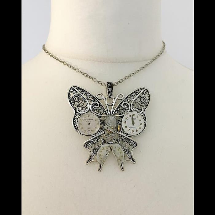 Lovely butterfly pendant decorated with vintage watch dials, watch mechanism. Chain length adjustable 40-51cm.