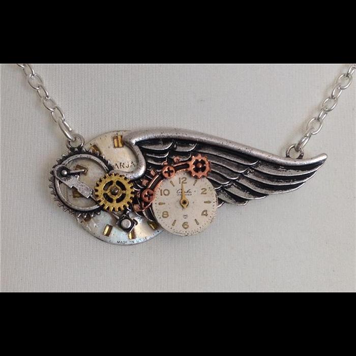 Lovely wing pendant decorated with watch cogs and vintage watch dials. Chain length adjustable 40-51cm.