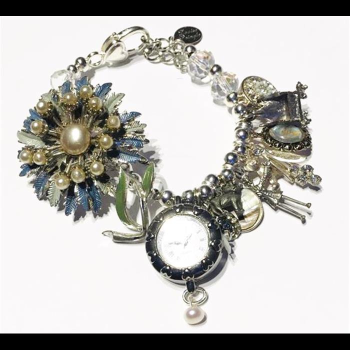 Bracelet made with vintage Art Deco Flower brooch, working (battery included) watch, 9 vintage charms, and crystal beads. Length adjustable to fit all wrist sizes and preferences. Please get in touch if you have special requirements. One-off design