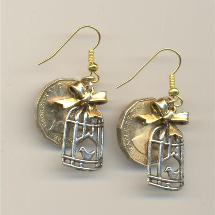 Earrings made up with 1942 and 1958 threepences, Gold bows and bird cages. Nickel free hooks.