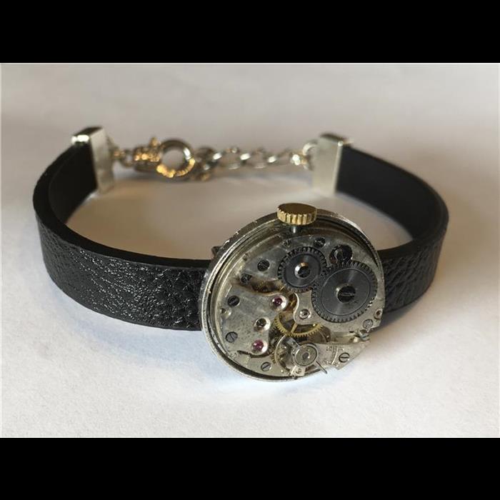 Leather look cuff with large vintage watch mechanism. Length adjustable (18.5 to 24cm) to fit all wrist sizes.