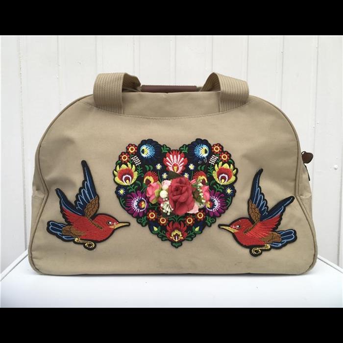 Large hold-all hand decorated (by me) with large decorative heart patch with material flowers and 2 x bird patches, Width 49cm, height 32cm, depth 25cm. . Completely one-off design.
