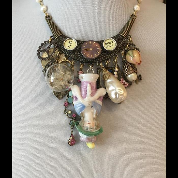 Necklace made freshwater pearl chain, 13 charms include; vintage china powder puff doll, real varnished rose bud, dandelion glass globe, butterfly, ivy leaf, watch cog, postage stamp charm, French Franc and more! Also includes vintage watch dial and typewriter key charms. Length adjustable 40-50cm. Please get in touch if you Would prefer a different length. One-off design
