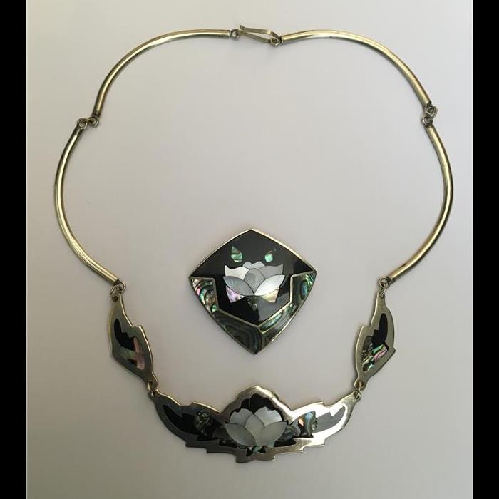 Beautiful (Alpaca Mexico Hallmark) mother of pearl and Paua shell necklace and matching brooch. Necklace length 43cm (length can be added on request). Brooch width 4.5cm.