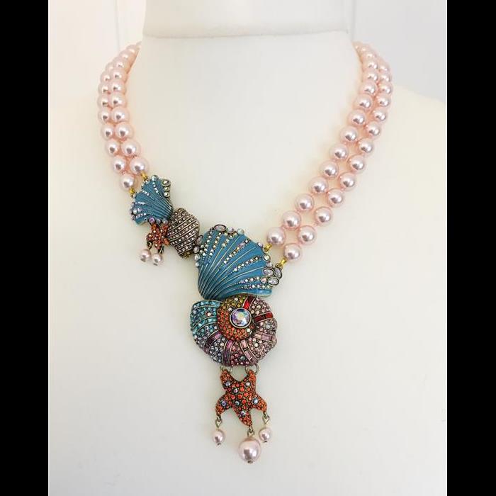 Stunning large (height of all pendants approx 14cm) enamel sea shell pendants with rhinestones and 2 x rows of pastel pink glass pearls, Necklace Length adjustable 52-59cm (on shortest strand).