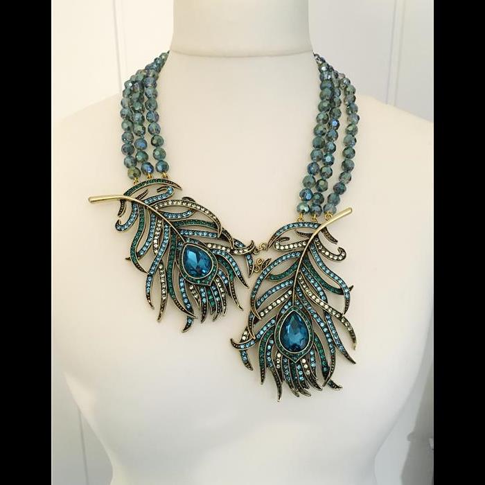 Stunning necklace strung with 2 large rhinestone peacock feathers (height 14cm) and 3 strands of gorgeous teal crystal beads.