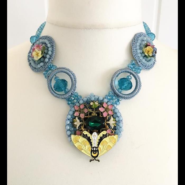 Necklace made with beautiful blue beaded necklace, Art Deco Vintage enamel brooch with green stone, enamel yellow moth brooch, and 2 x vintage porcelain flowers. Length adjustable to fit all neck sizes and preferences. Please get in touch if you have special requirements