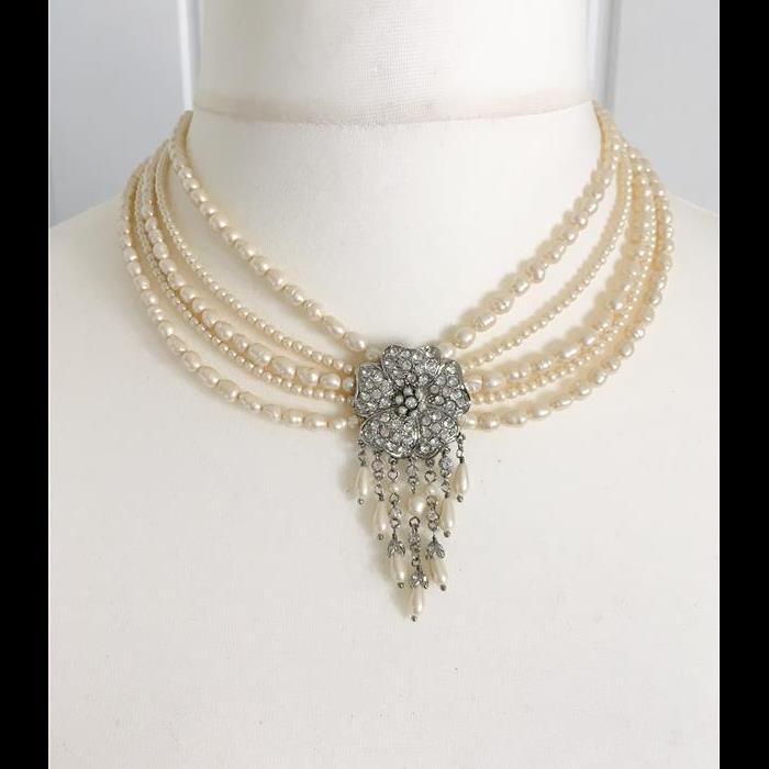Stunning 4 Strand Freshwater Pearl and rhinestone flower Necklace with beautiful pearl drops. Length adjustable so it can be worn higher up as choker or lower down as shown on picture.
