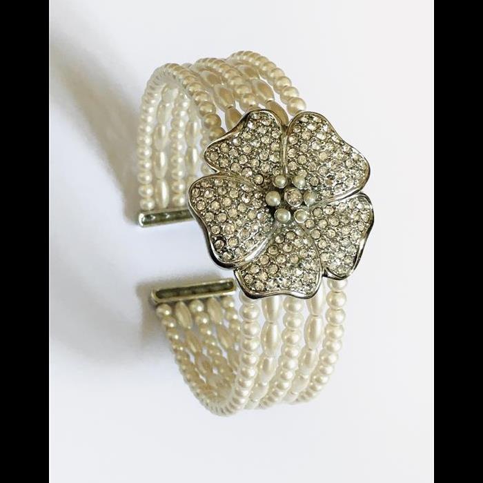 Stunning 5 Strand Faux Pearl and Rhinestone Flower Bracelet