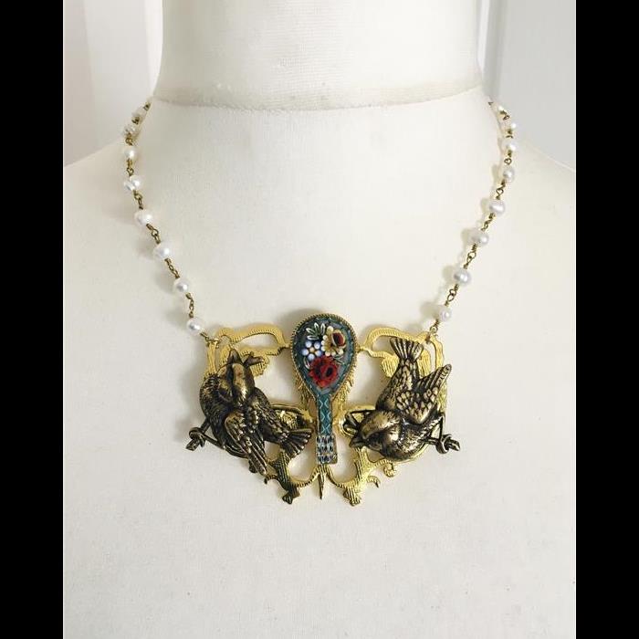 Necklace made with a beautiful brass base, two gorgeous brass birds, a vintage Italian Micro Mosaic brooch and freshwater pearl chain.