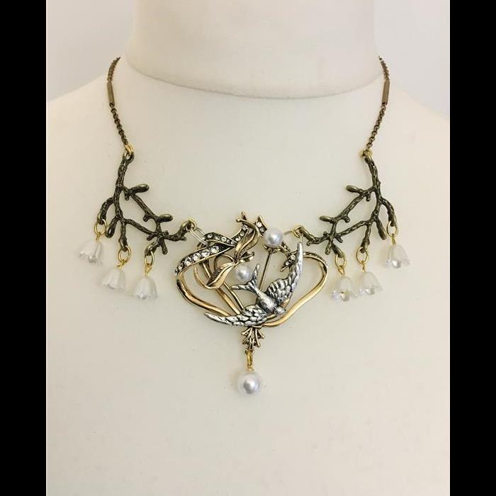 Necklace made with a stunning Art Nouveau style brooch, organic branch connectors, beautiful pearly white flower drops, and a gorgeous silver tone brass swallow. Length adjustable to fit all neck sizes.