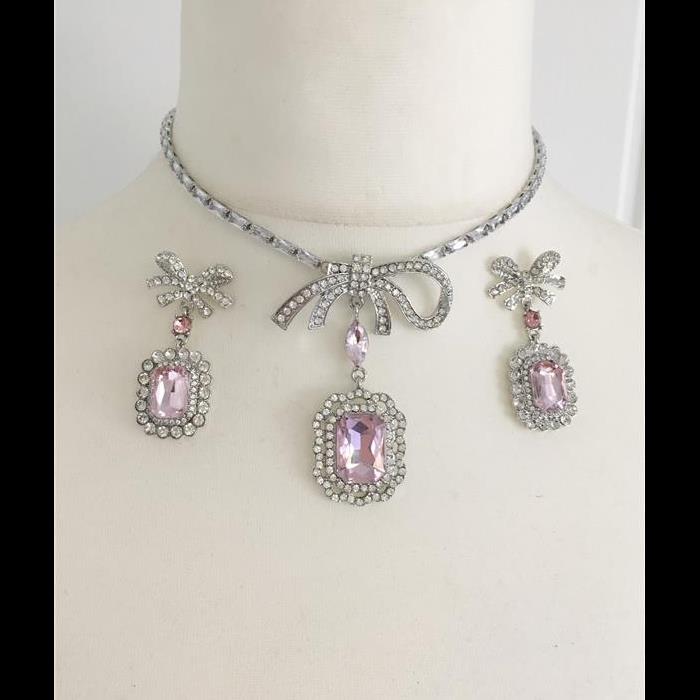 Pink Bowknot Crystal Necklace and Earrings Set
