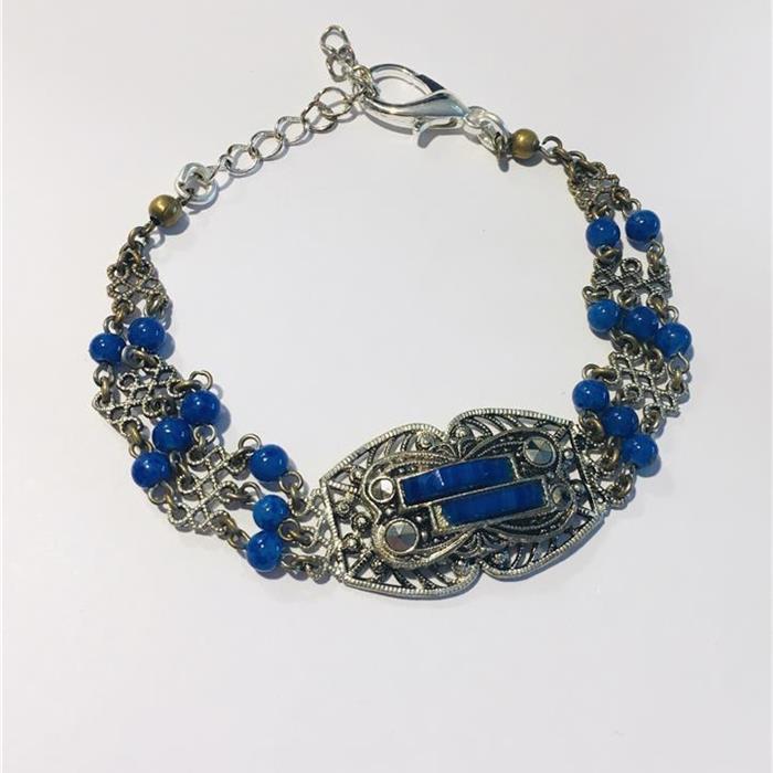 Vintage Deco Lapis Czech Glass Silver over Brass Bracelet