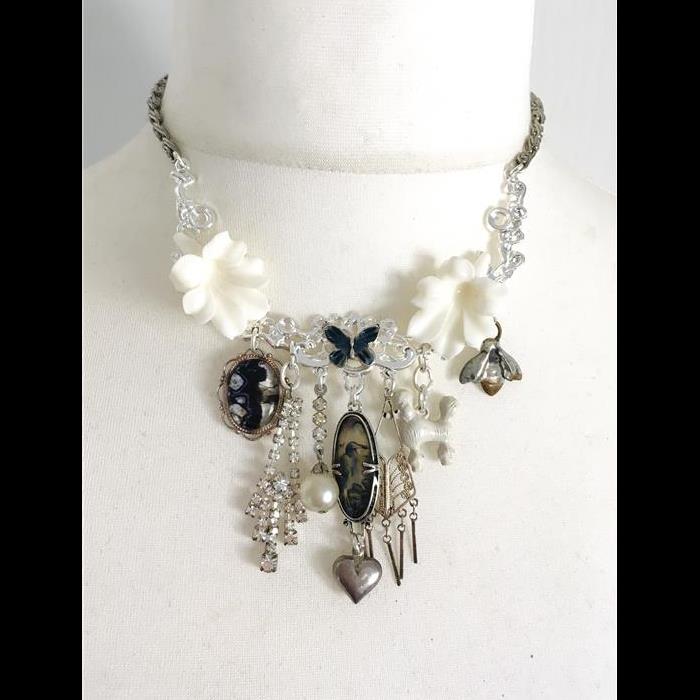Necklace made with silver tone pendant 8 vintage charms and 2 beautiful white acrylic flowers.