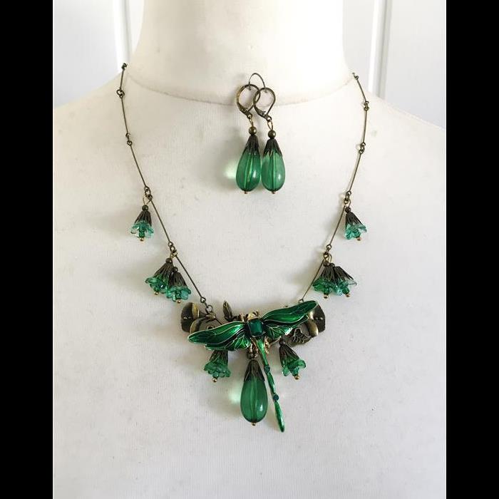 Art Deco style necklace and earrings set with beautiful green enamel dragonfly. Necklace adjustable length 55-62cm. Earrings for pierced ears.