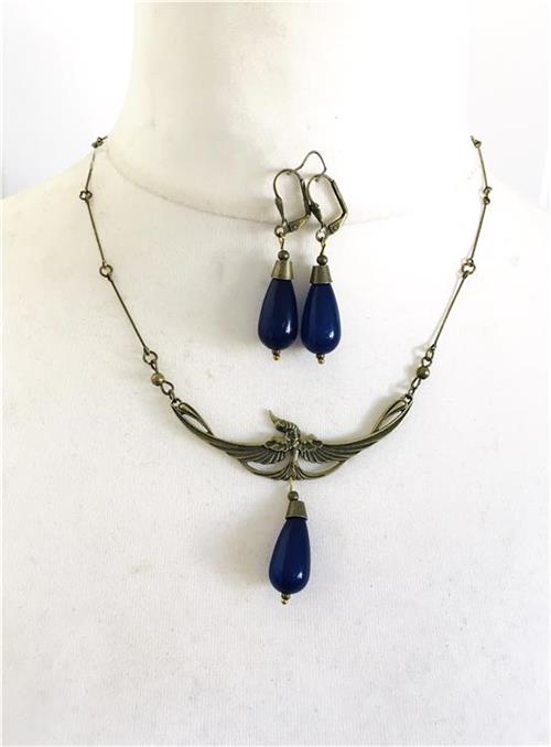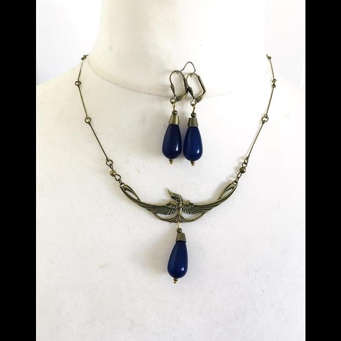Art Deco style necklace and earrings set with beautiful swallow centrepiece. Necklace adjustable length 49-55cm. Earrings for pierced ears.