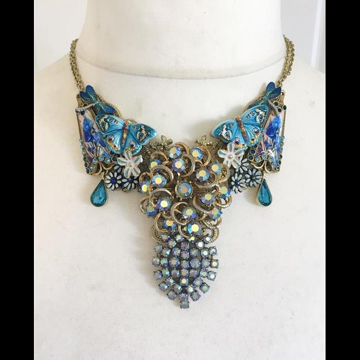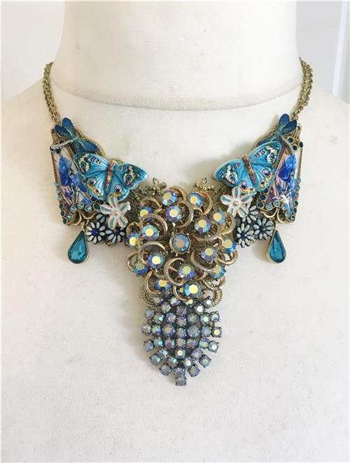 Necklace made with a beautiful filigree base, 2 x vintage Aurora Borealis crystal brooches, a pair of stunning Art Deco style enamel Iris earrings, vintage flower decorations, 2 x beautiful blue butterflies and 2 x blue enamel dragonflies.
