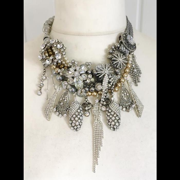 Necklace made with multiple vintage/modern rhinestone earrings/ pendants/ pearl beads and brooches.