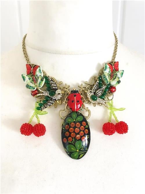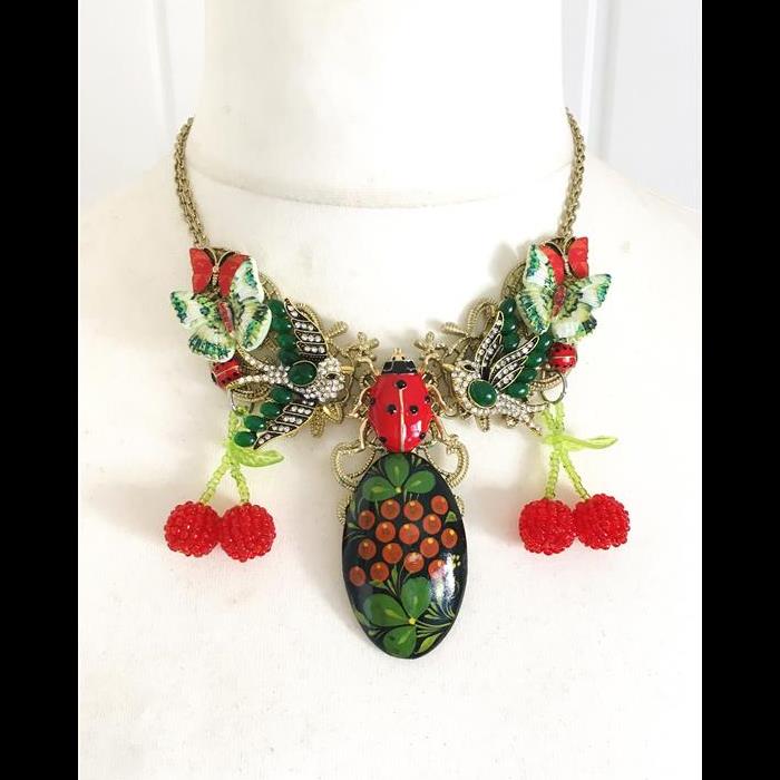 Necklace made with a beautiful hand-painted vintage berry brooch, enamel lady bird brooch, pair of rhinestone swallows, pair of enamel orange butterflies, pair of green butterflies, pair of tiny enamel ladybirds and pair of beautiful beaded cherry pendants.