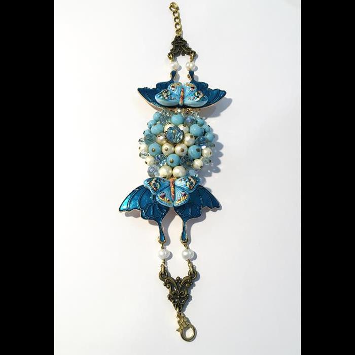 Bracelet made with large vintage blue beaded brooch, 2 x enamel blue butterfly wing pendants, 2 x beautiful blue butterflies and 4 x freshwater pearl beads. Adjustable length 20-24cm.