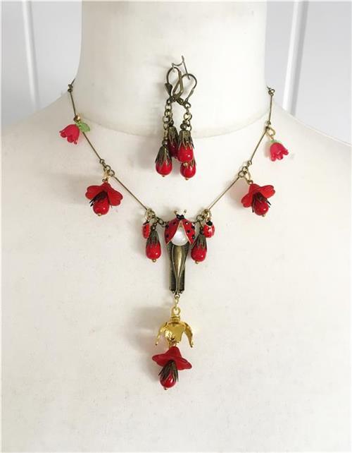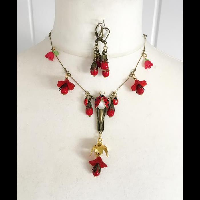 Necklace made with brass tones Art Nouveau style findings, red berry stones, red lucite flowers, small ladybird brooch.