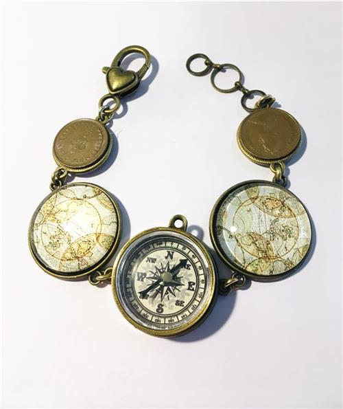 Bracelet made with real working compass, old map printed under glass, and a pai of old had-penes. Adjustable length 18-21cm (length can be added on request free of charge).
