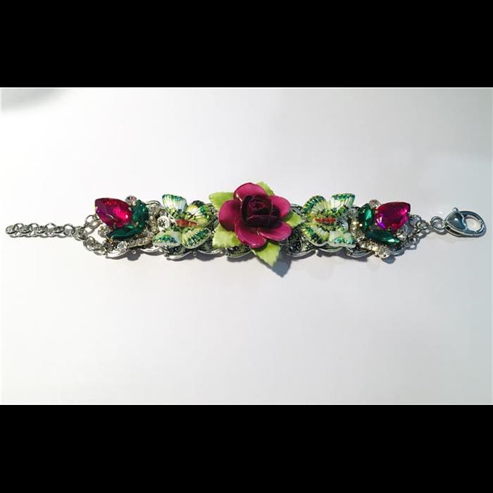 Bracelet made with silver tone panels with vintage red rose porcelain brooch, pair of green butterflies, and pair of beautiful rhinestone pendants. Adjustable length 18-22cm (length can be added free of charge on request).