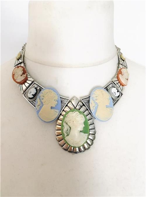 Necklace made with an Art Deco style silver tone necklace base, and 9 vintage and new cameos including 2 x real shell cameos (the 2 x medium sized orange ones).