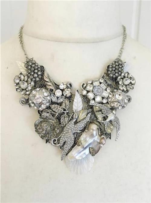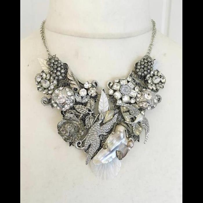 Necklace made with various vintage/modern rhinestone/baroque pearl/mother-of-pearl beautiful jewellery pieces.