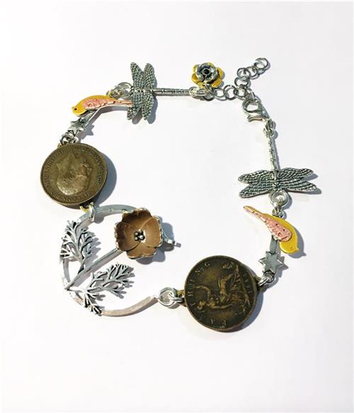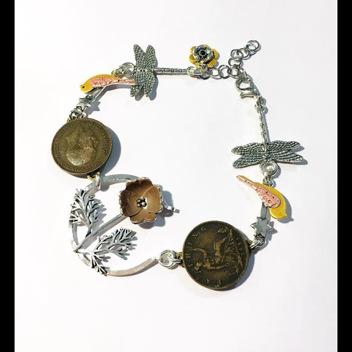 Bracelet made with beautiful flower pendant, pair of old farthings, pair of little birds, pair of dragonflies. Adjustable length to fit all wrist sizes approx 20-24cm