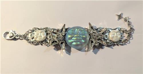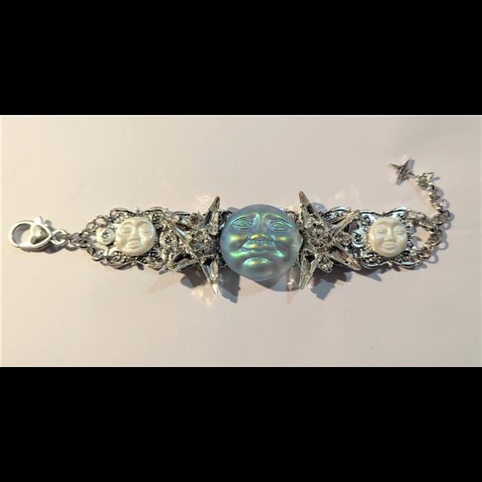 Bracelet made with silver tone panels a gorgeous iridescent Moon Face, pair of super sparkly rhinestone stars, and a pair of milky moon faces. Adjustable length 18-22cm (length can be added free of charge on request).