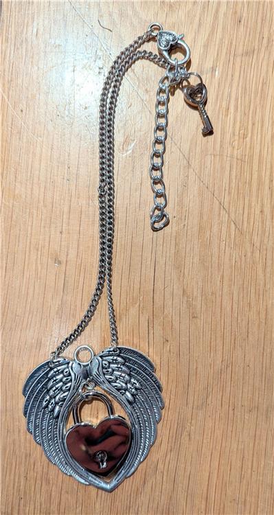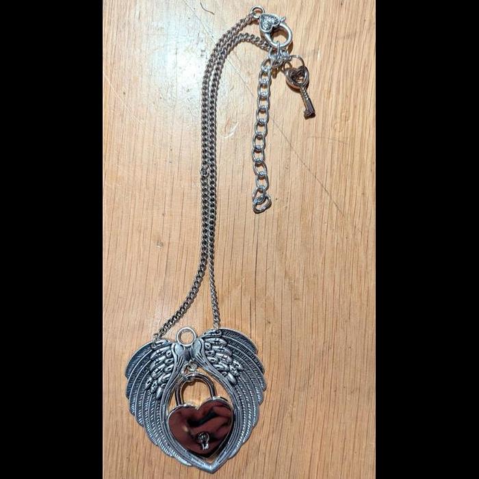 Necklace made with wings pendant with heart shaped (functioning) padlock with key on the the of the chain.