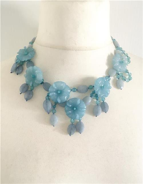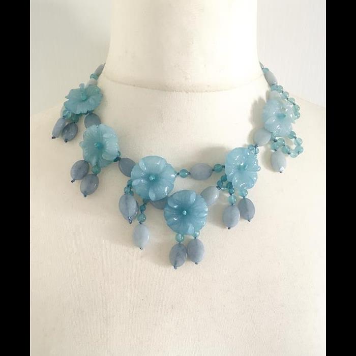 Stunning blossom necklace made with semi precious (blue aqua Jade) flowers, leaves and beads.