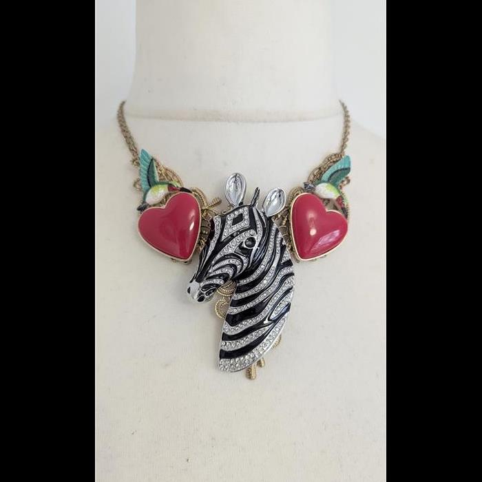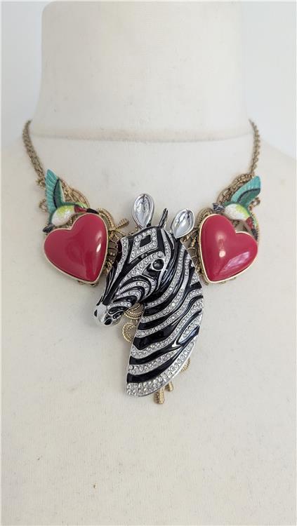Necklace made with large zebra head brooch. Pair of heart earrings and pair of small humming birds.