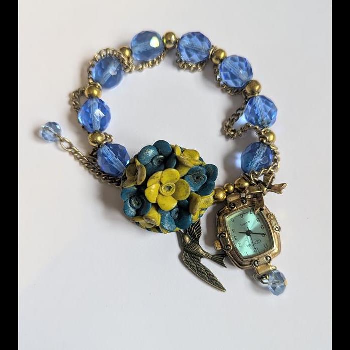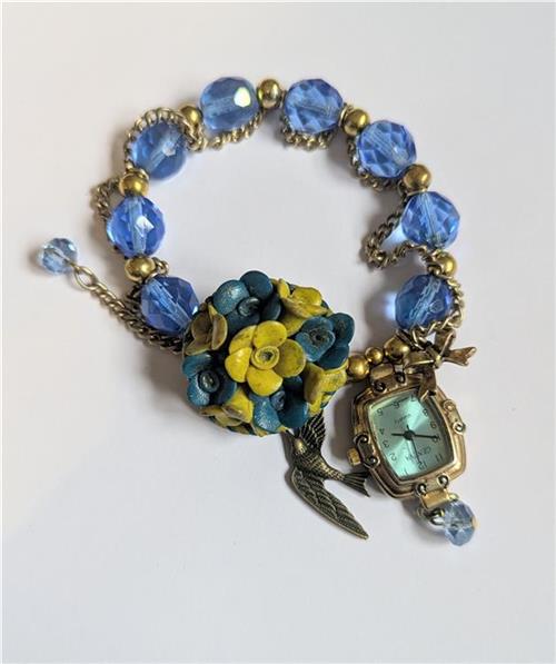 Special sale bracelet. Curios charm bracelet made with vintage brooch. Watch does work and has a new battery. Double strung on special strong elastic. Medium size.