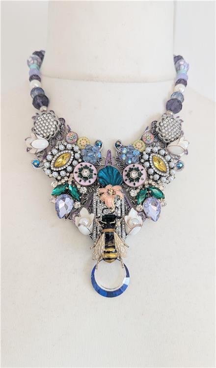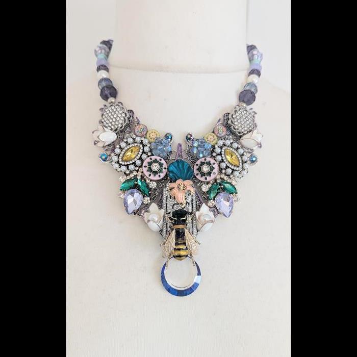 Necklace made with lovely enamel bee brooch, various buttons, earrings, rhinestones and beads.