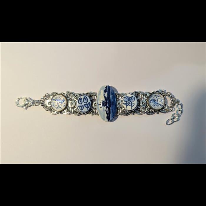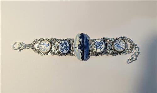 Bracelet made with beautiful silver tone filigree cuff bracelet, vintage Delft Windmill Brooch, pair of porcelain tulip pendants, pair of glass dome bird pendants. Adjustable length.
