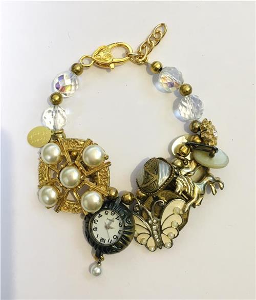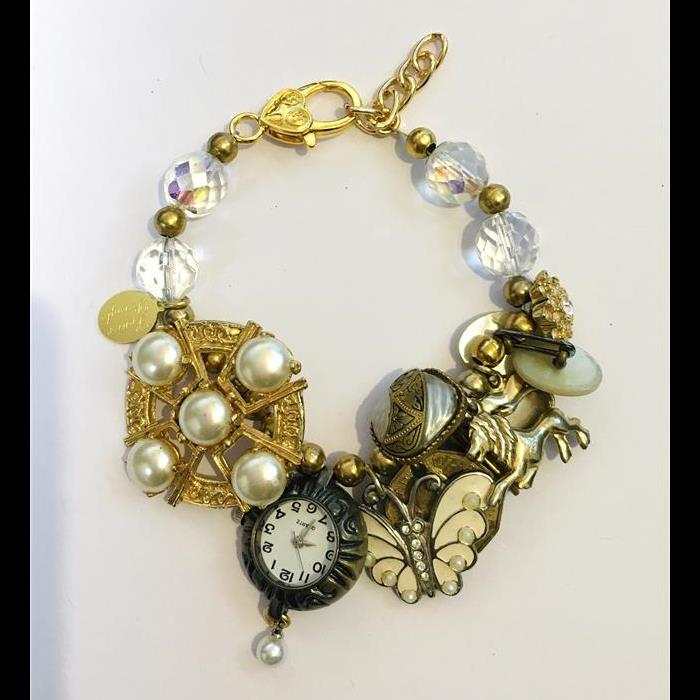 Bracelet made with vintage Flower brooch, working (battery included) watch, 8 vintage charms, and crystal beads. Length adjustable to fit all wrist sizes and preferences. Please get in touch if you have special requirements. One-off design
